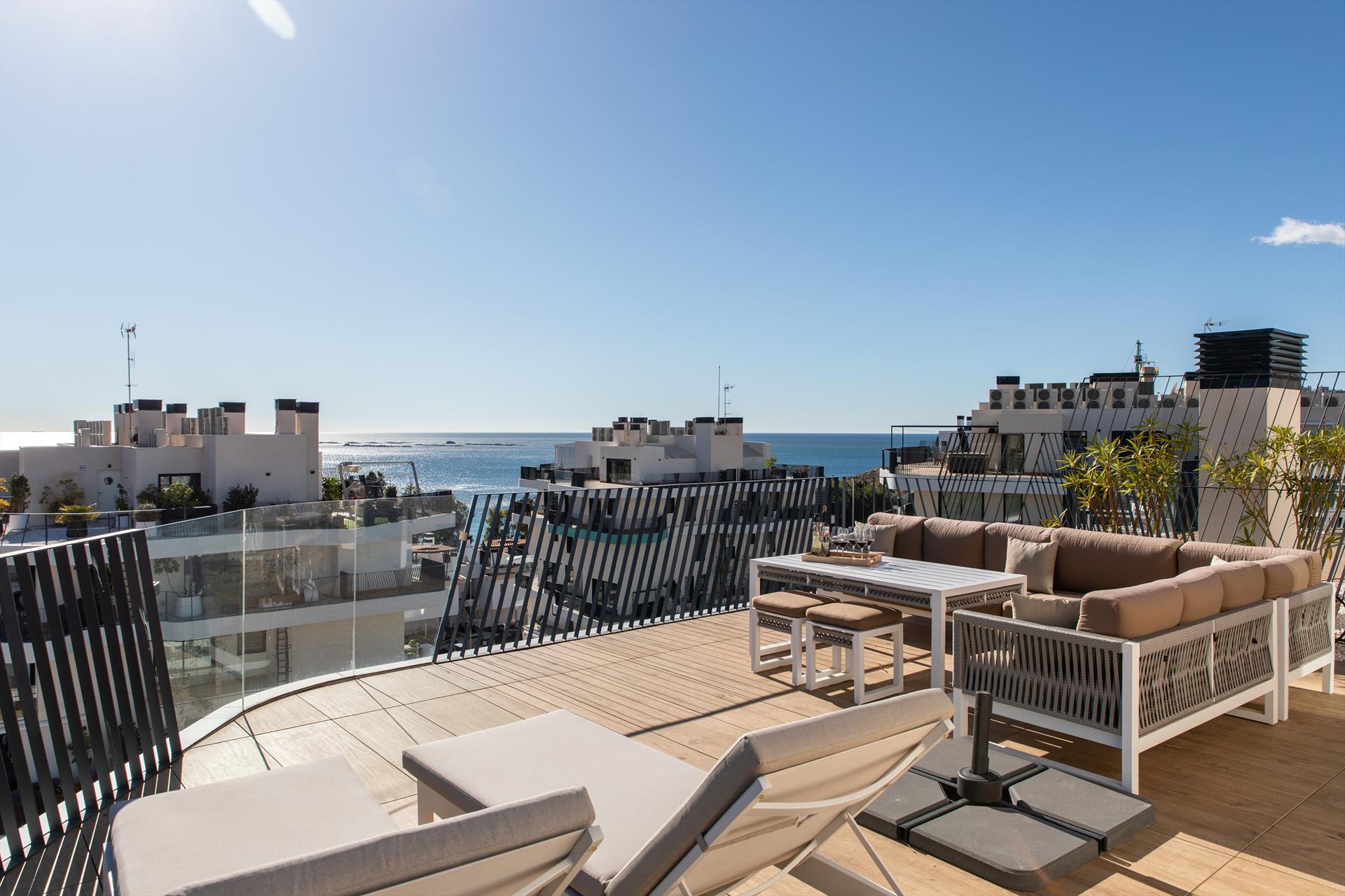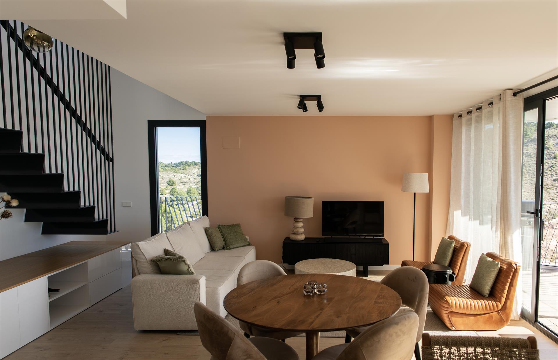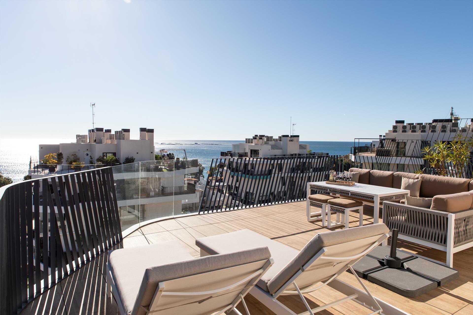 El penthouse cuenta con 3 dormitorios y 3 baños, distribuidos en 2 niveles. El alojamiento ofrece privacidad, un jardín comunitario con césped y árboles, maravillosas vistas al mar y hermosas vistas del valle, las montañas y la calle. Su confort y la proximidad a la playa, actividades deportivas y opciones de entretenimiento hacen de este un penthouse ideal para pasar sus vacaciones en España con familia o amigos.