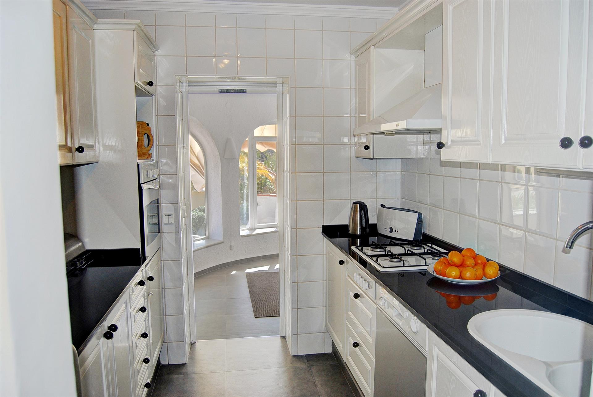 • cocina con placa de gas, horno eléctrico, microondas, lavavajillas, frigorífico-congelador, cafetera, hervidor eléctrico, batidora, tostadora y exprimidor