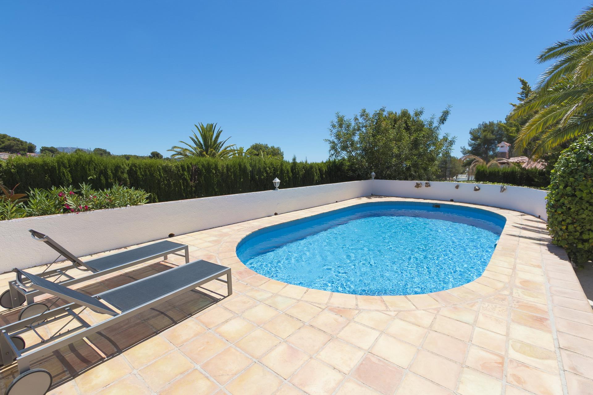 La casa cuenta con 3 dormitorios y 3 baños, distribuidos en 2 niveles. El alojamiento ofrece mucha privacidad, un jardín con grava y árboles, una maravillosa piscina y vistas a las montañas. Su comodidad y la proximidad a la playa, actividades deportivas, instalaciones de entretenimiento, puntos de interés y cultura hacen de esta una casa ideal para pasar sus vacaciones en España con familia o amigos.