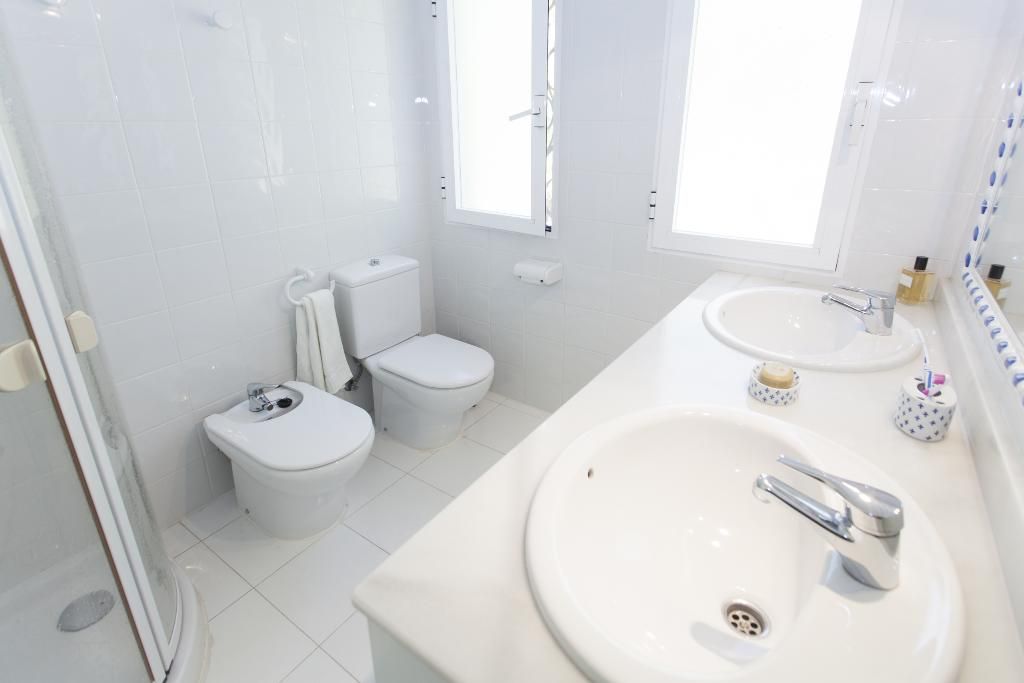 • baño en suite con lavabo doble, bañera, ducha y aseo