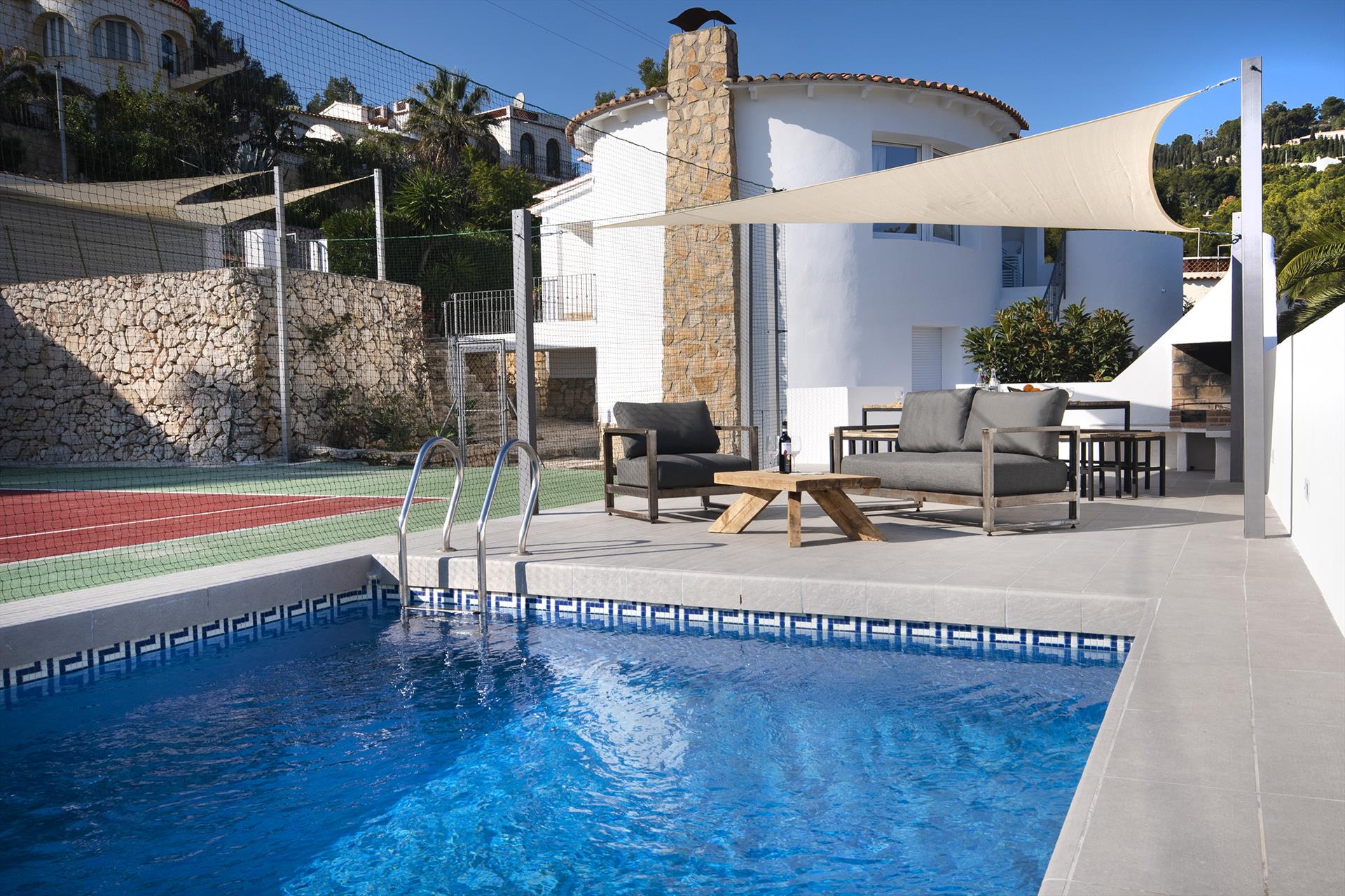 Moderne und freundliche Villa mit privatem Pool in Benissa, Costa Blanca, Spanien für 8 Personen. Das Haus befindet sich in einem Küsten- und Wohngebiet, in der Nähe eines Tennisplatzes, 2 km vom Strand Cala Abogat und 5 km von Moraira entfernt.