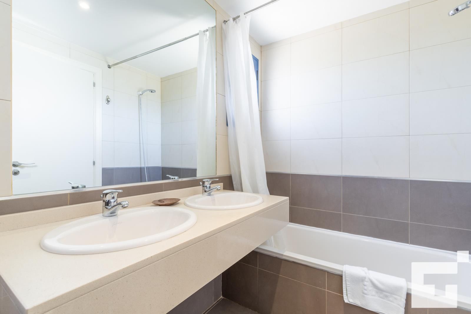 • bathroom with double washbasin, bath, and toilet
