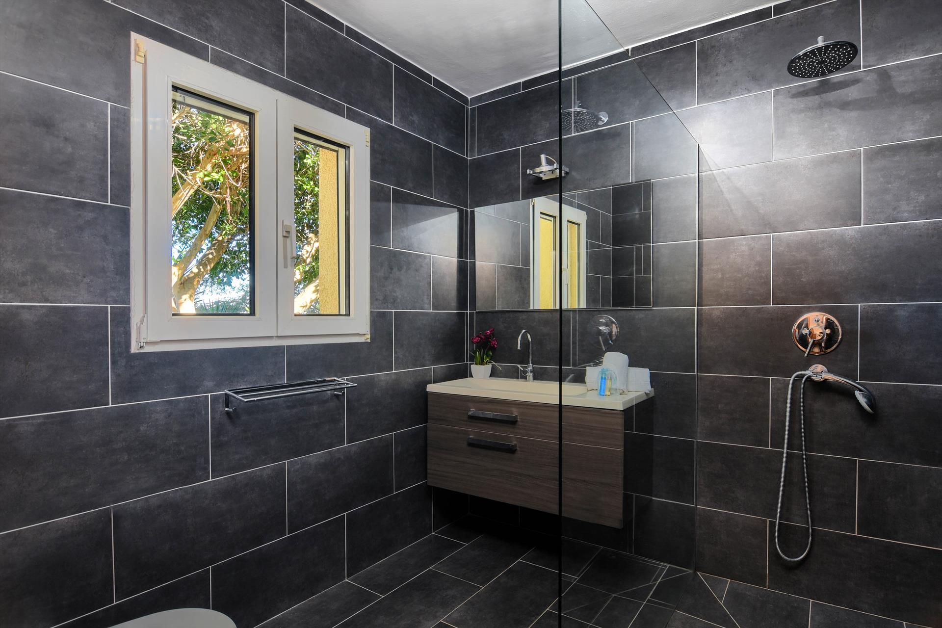 • bathroom with single washbasin, shower and toilet