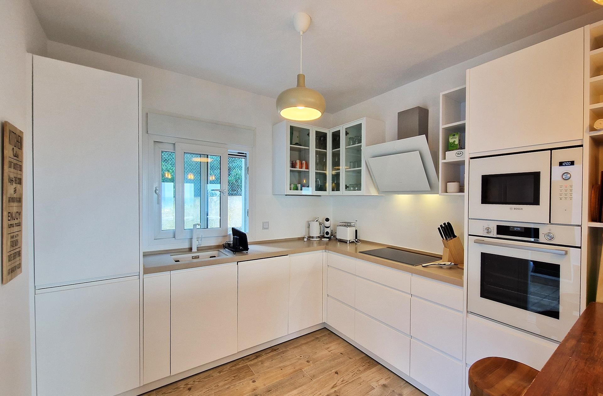 • open kitchen with electric hob, electric oven, microwave, dishwasher, refrigerator-freezer, coffee machine, electric kettle, mixer and toaster