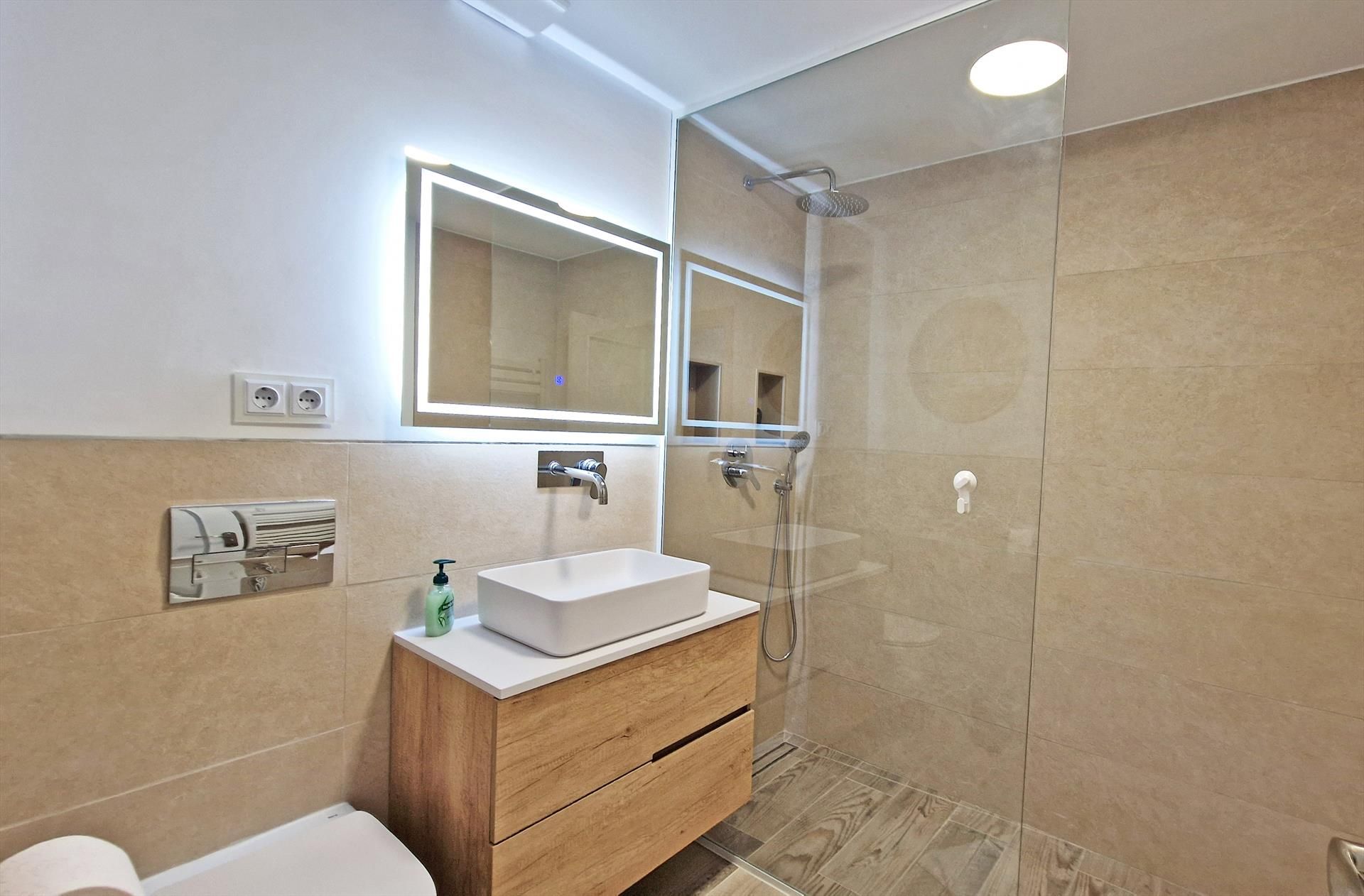 • en-suite bathroom with double washbasin, shower, toilet and hairdryer
