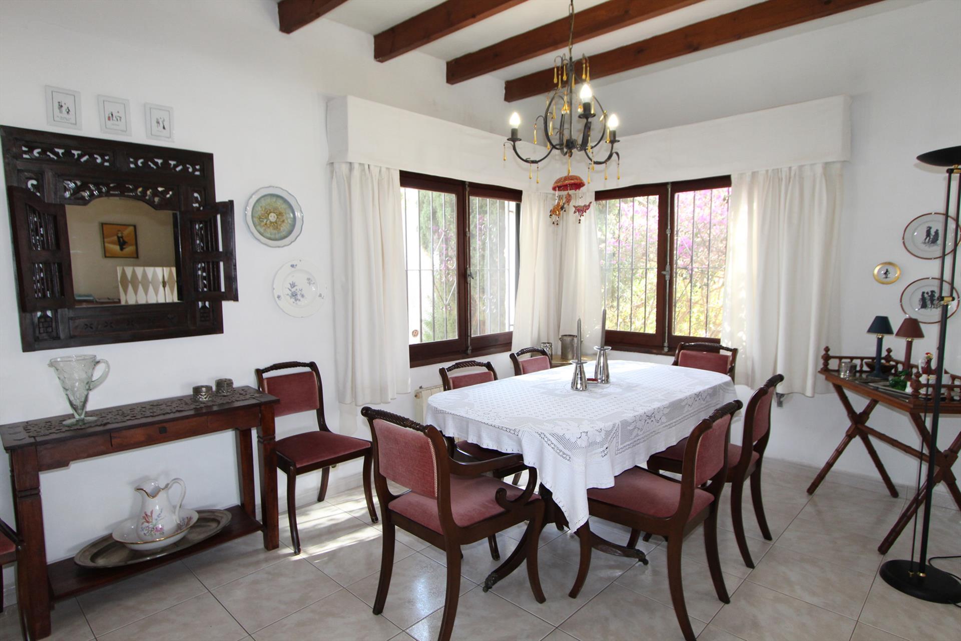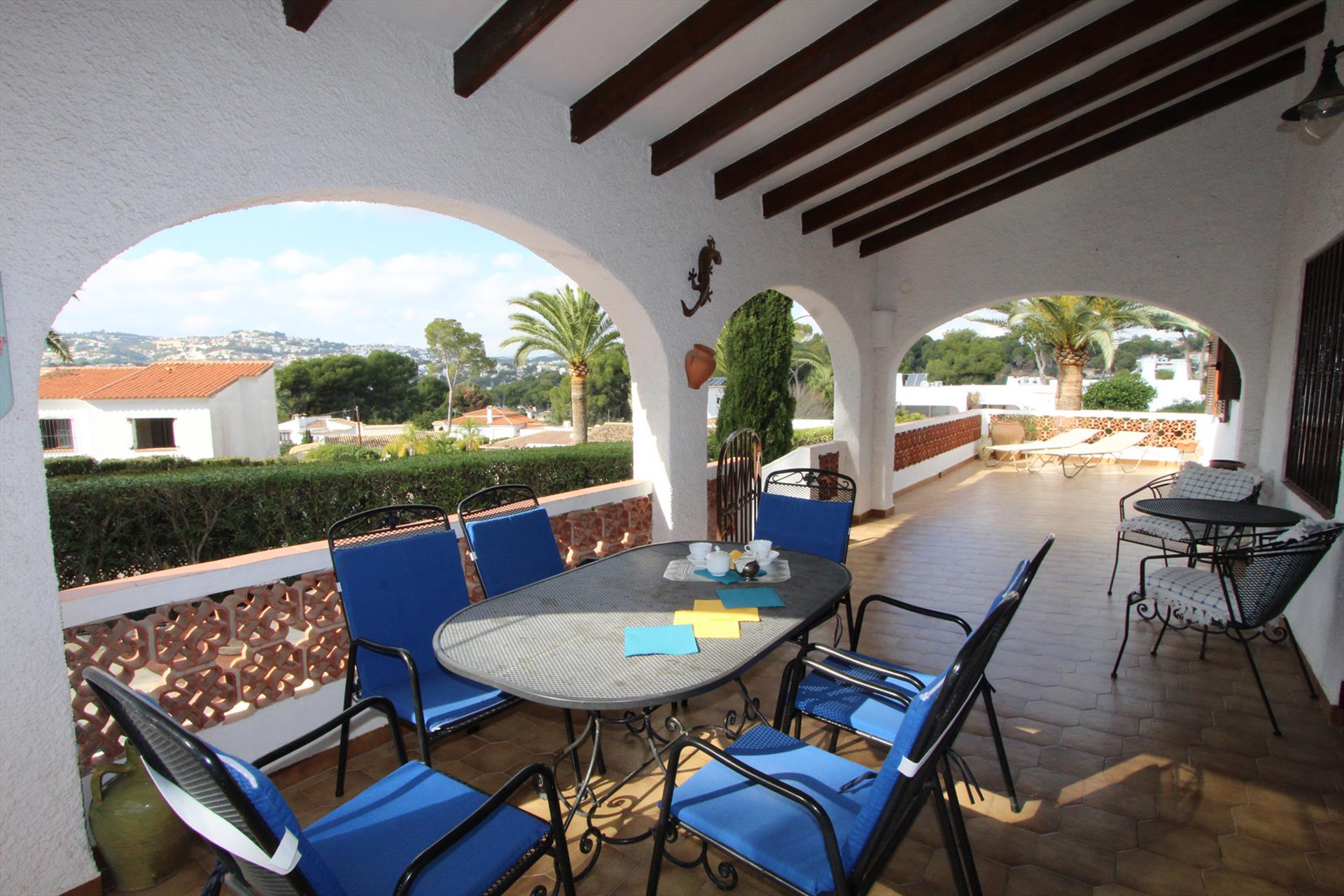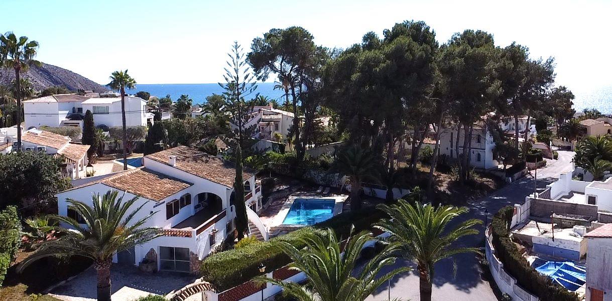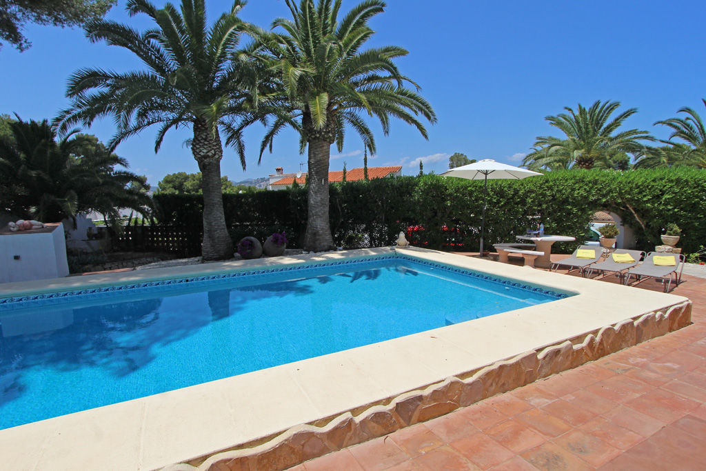 Belle villa classique avec piscine privée à Moraira, sur la Costa Blanca, Espagne pour 8 personnes. La maison de vacances est située dans une région résidentielle, près de restaurants et bars, de magasins, de supermarchés et d'un court de tennis et à 500 m de la plage de ampolla.