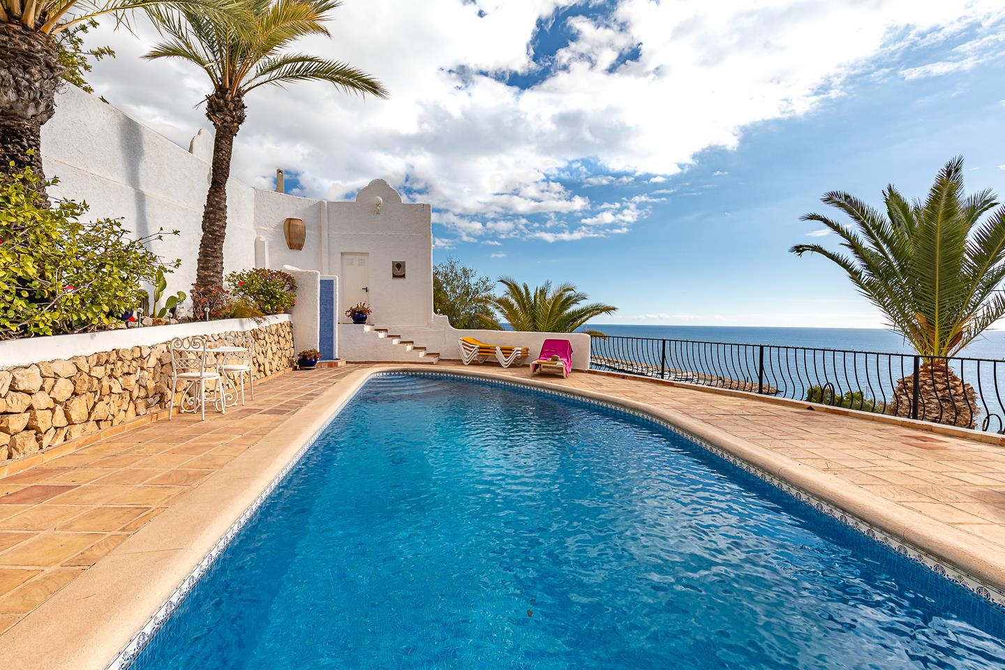 Comfortabele villa in Altea, Costa Blanca, Spanje met een privézwembad voor 6 personen. Het huis is gelegen in een heuvelachtige en residentiële kustzone en ligt op 200 m van het Campomanes-strand.