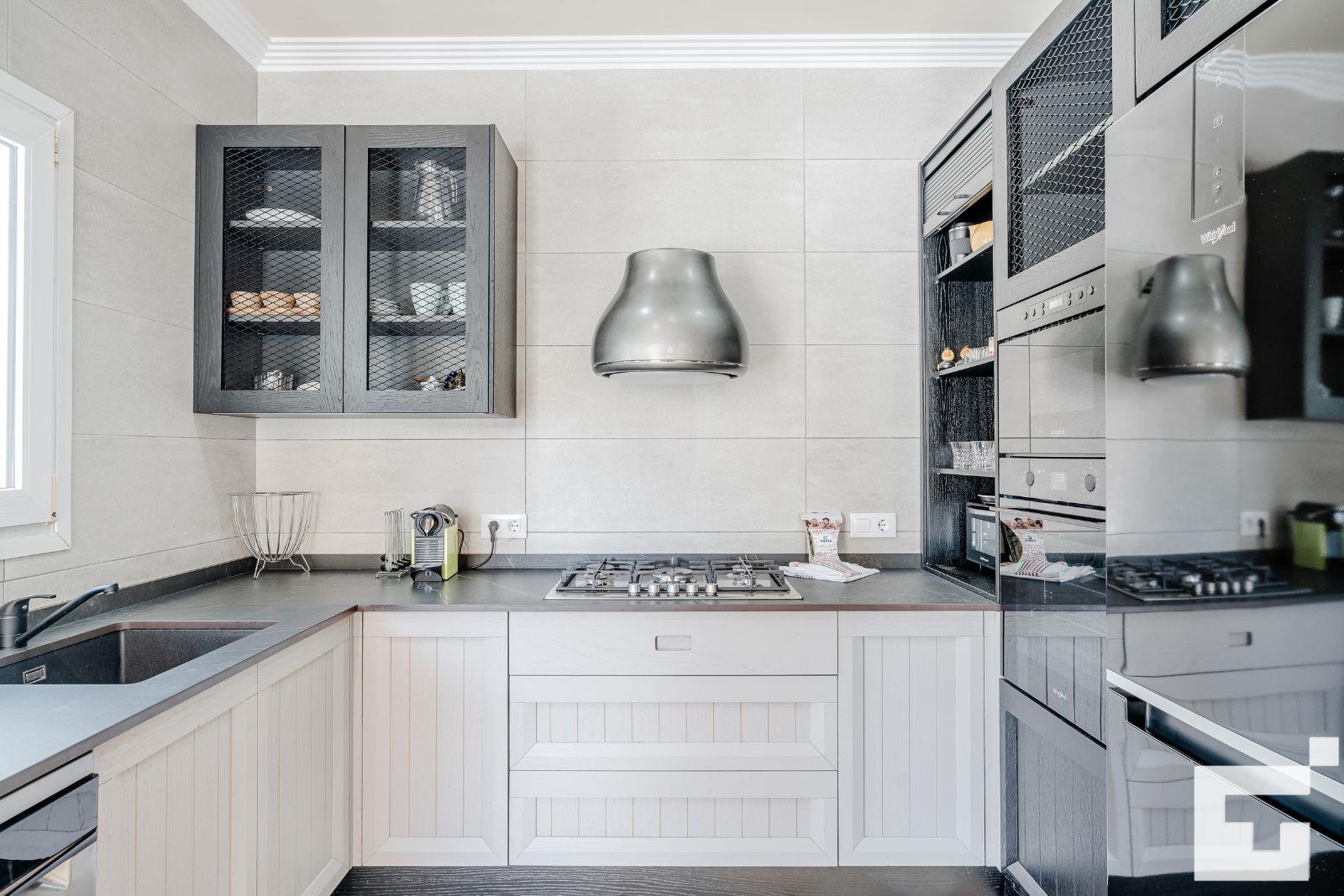 • open keuken met elektrische kookplaat, elektrische oven, magnetron, vaatwasser, koelkast, vriezer, koffiezetapparaat, waterkoker, mixer, broodrooster en juicer