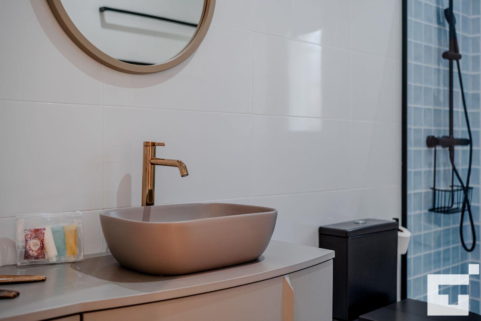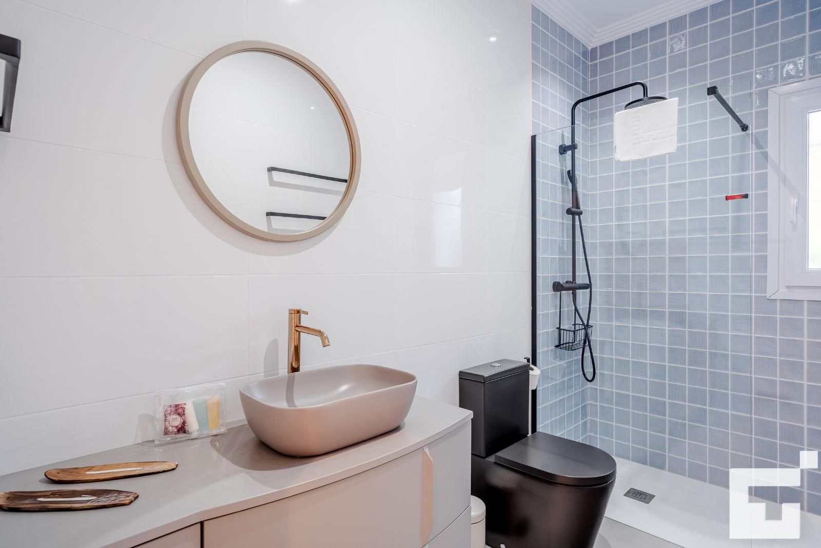 • badkamer met enkele wastafel, douche en toilet