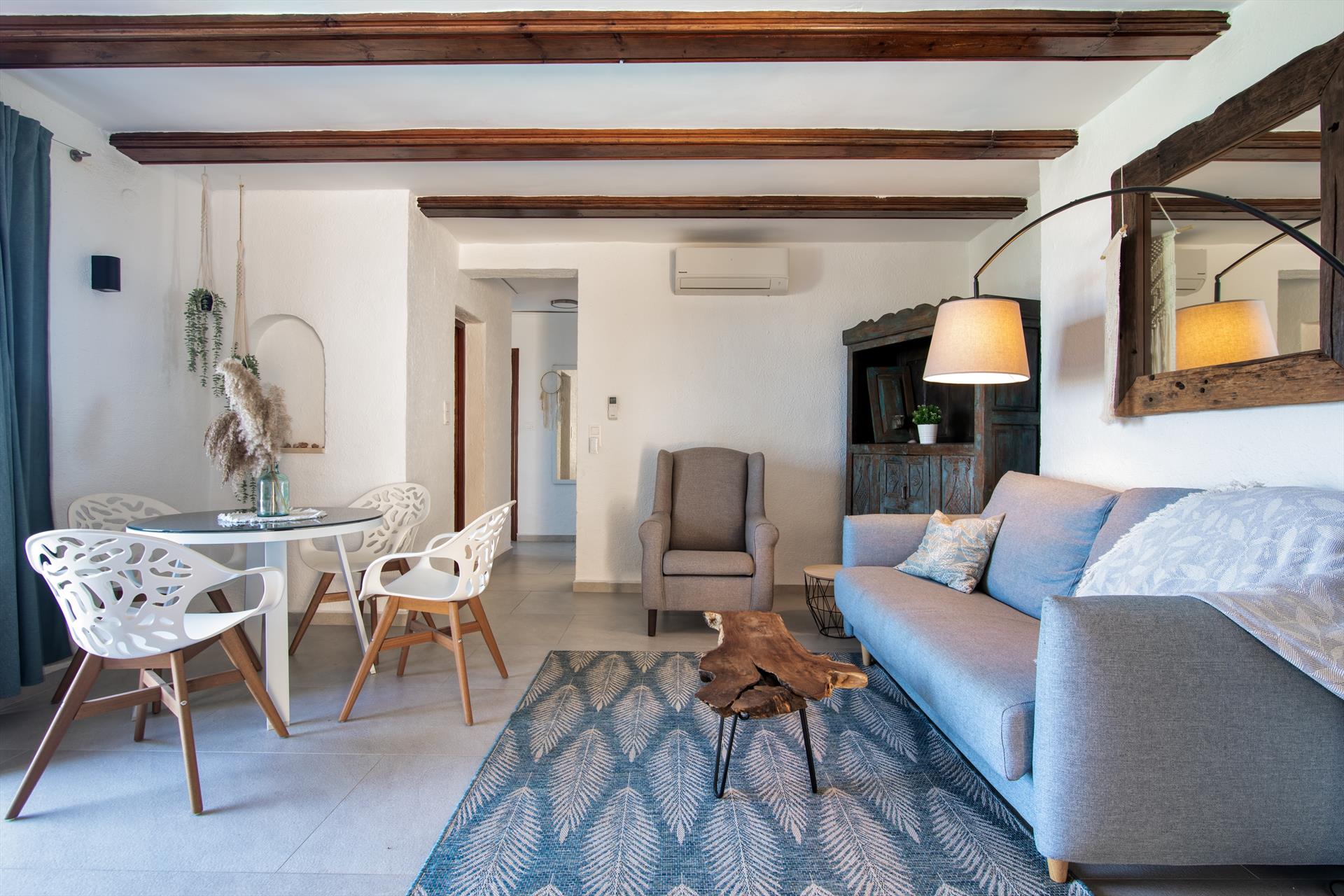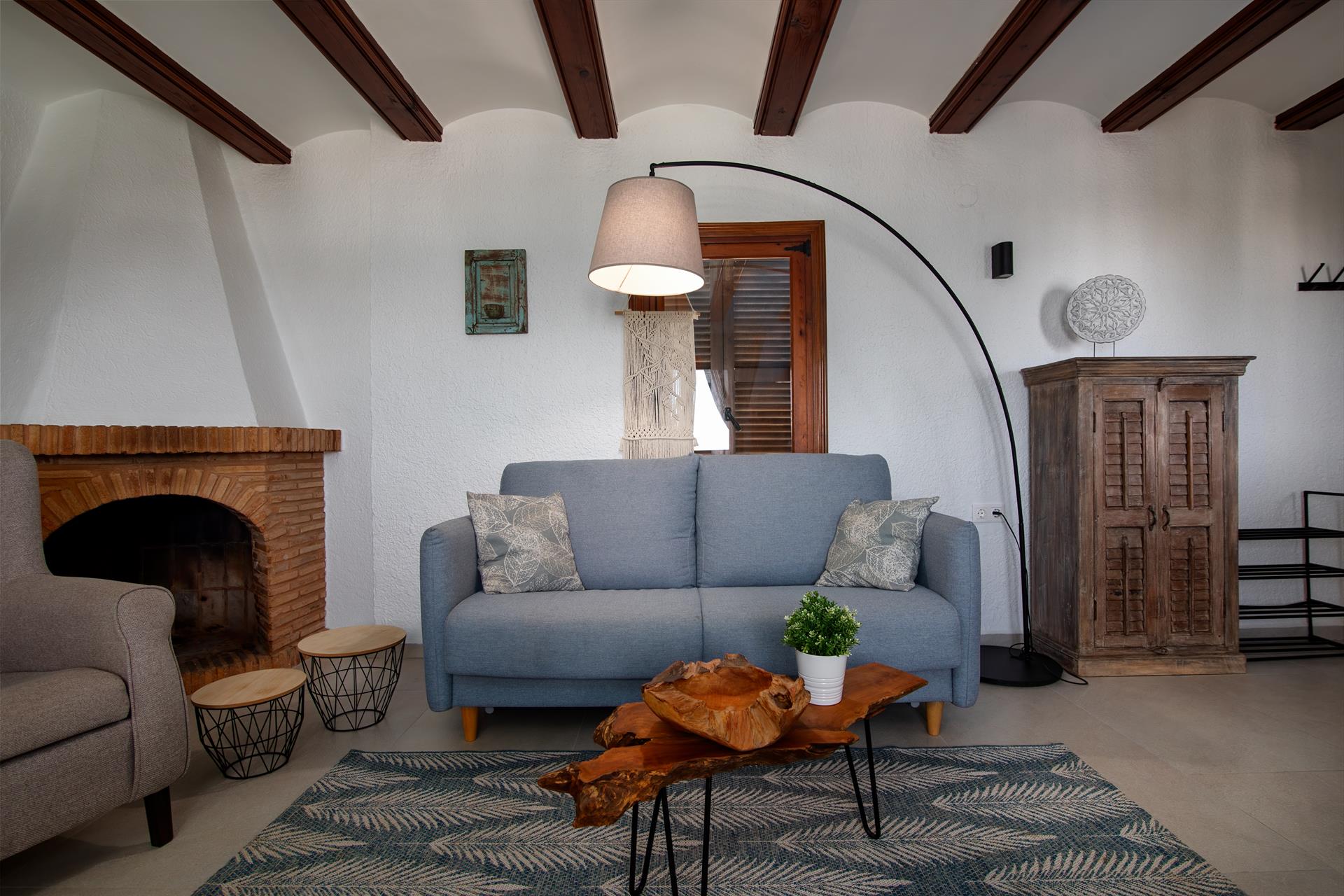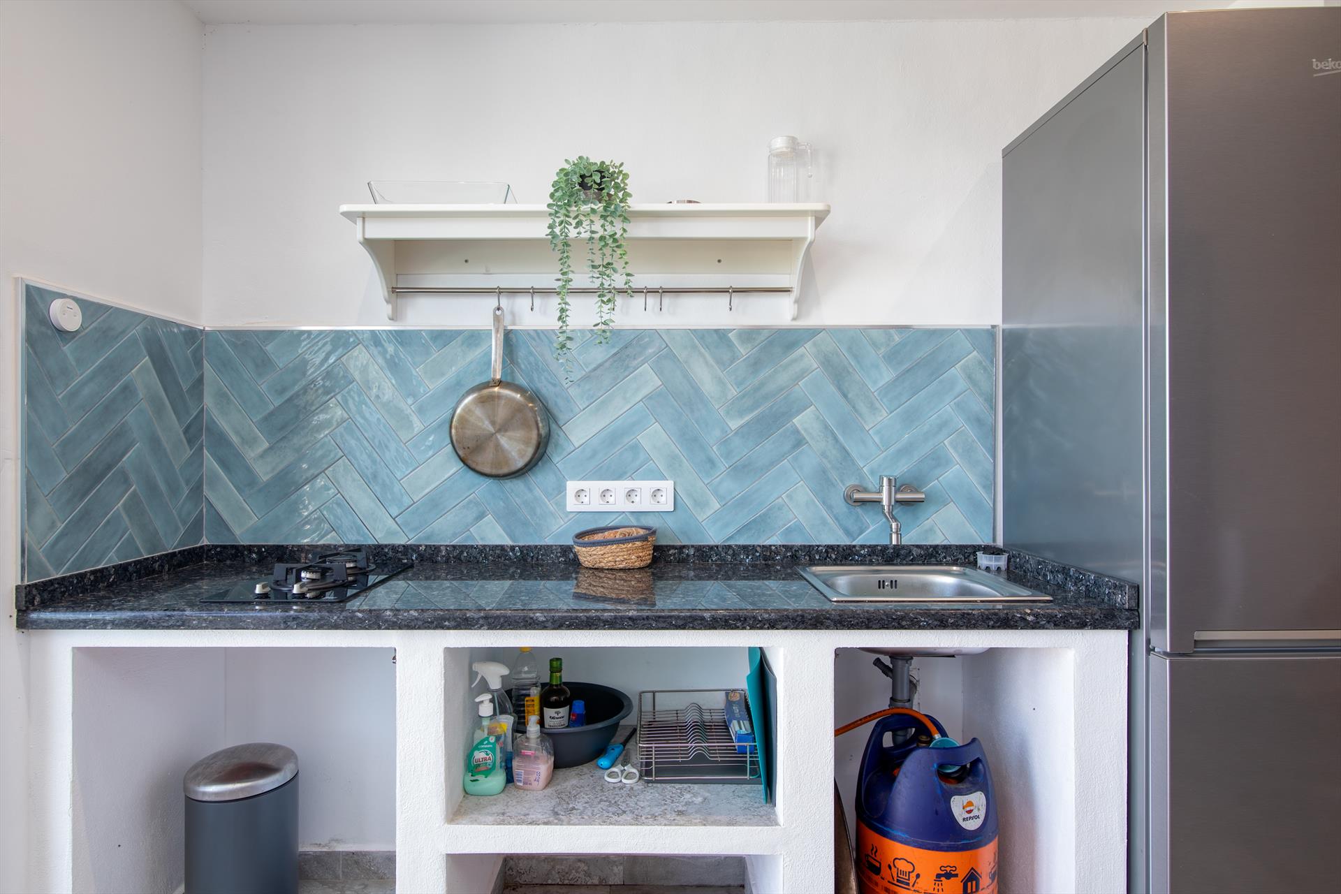 Interieur: Koelkast, oven of elektrische grill, koffiezetapparaat, toaster, waterkoker, strijkijzer, strijkplank en staafmixer.