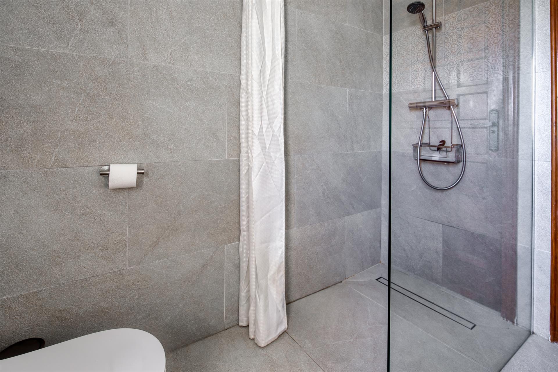 • badkamer met enkele wastafel, douche, toilet en haardroger