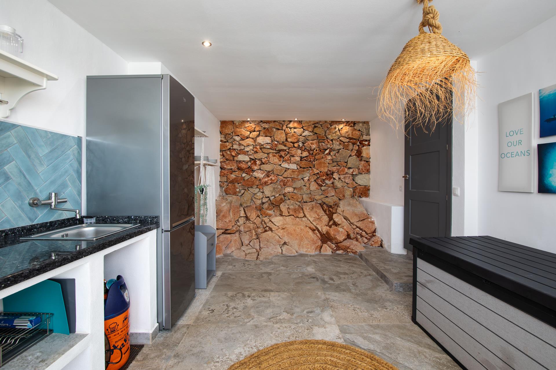 Interieur: Koelkast, oven of elektrische grill, koffiezetapparaat, toaster, waterkoker, strijkijzer, strijkplank en staafmixer.